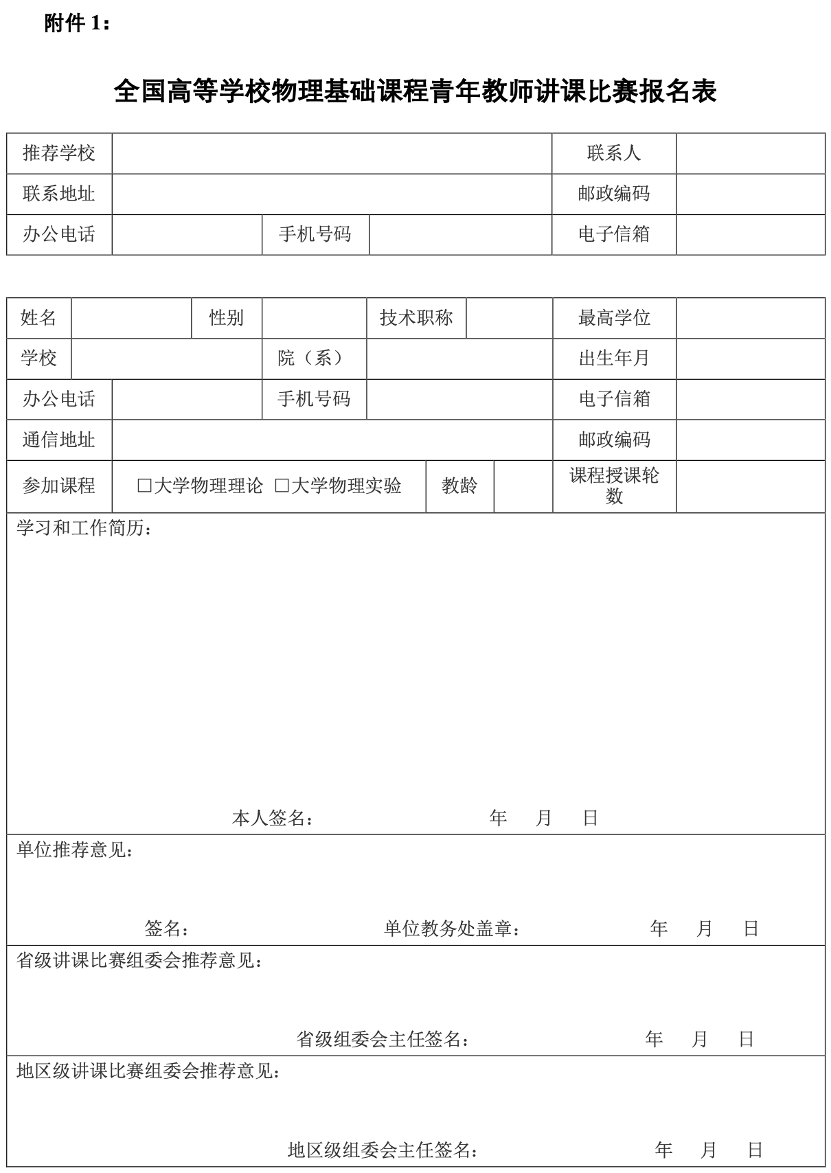 讲课比赛教师应填写《全国高等学校物理基础课程青年教师讲课比赛报名表》(附件1),由组委会对参加讲课比赛教师的资格进行审定,如果报名表与实际情况不符,组委会有权取消比赛教师资格,情节严重者可以取消教师所在学校参加同类比赛的资格一次或多次。