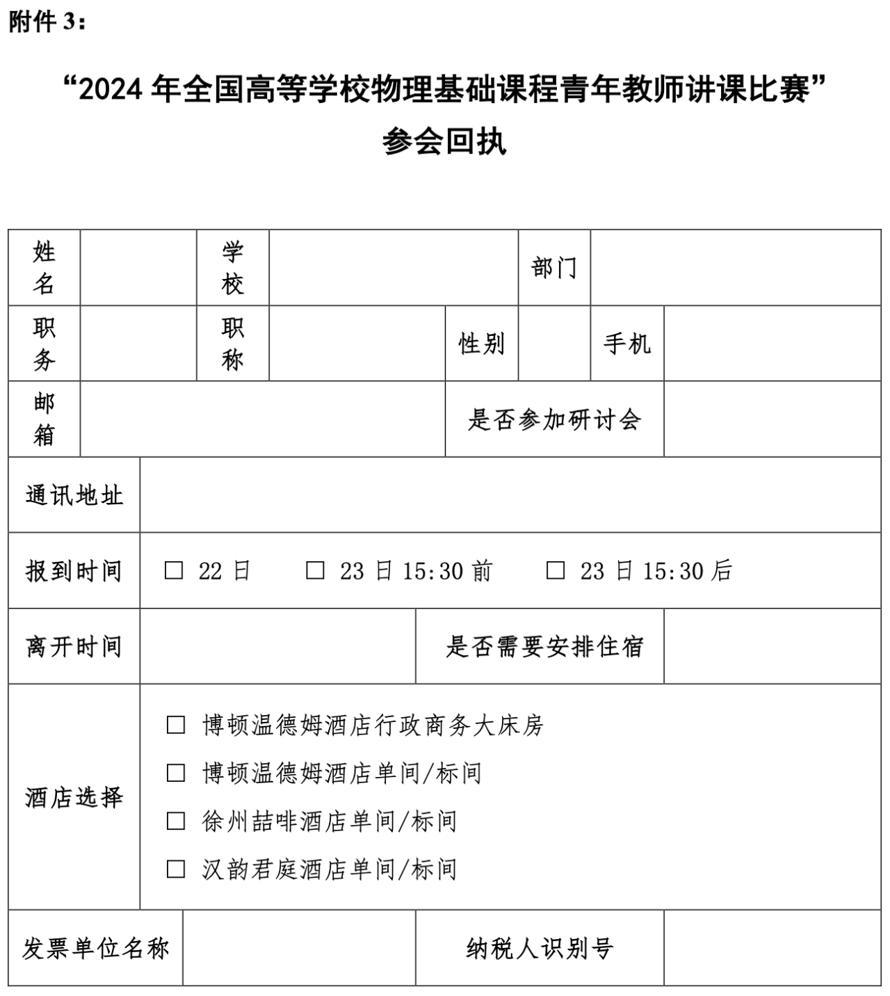 参赛选手填写《2024年全国高等学校物理基础课程青年教师讲课比赛”参会回执》(附件3),发送到邮箱zpxun@cumt.edu.cn