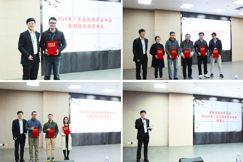 年会还邀请了17位本省专家学者分别报告了他们在理论物理、凝聚态物理、量子信息、天体物理、光电材料、大学物理教学等等领域的最新研究成果。张贴海报受到青年学者热烈欢迎,共47份学术粘贴报告,学术水平为历年最高。经过专家委员会评议,南方科技大学张君华老师和华南师范大学鲍芳琳老师分别荣获张贴报告一等奖;中山大学唐健和王伟良老师、华南师范大学杜孟艳同学、华南理工大学陆久阳老师和中国科学院大学卡弗里理论科学研究所张嘉龙同学分别荣获张贴报告二等奖;佛山科学技术学院秦锡洲老师、中山大学沈冰老师、南方科技大学郑盛根老师、华南师范大学周静同学、暨南大学徐毅老师和深圳大学魏松瑞老师分别荣获张贴报告三等奖。本次年会的丰富精彩学术报告,展示了广东省物理学工作者科研水平达到了国际水平,省内各高校在人才建设和研究条件建设方面获得显著成效。
