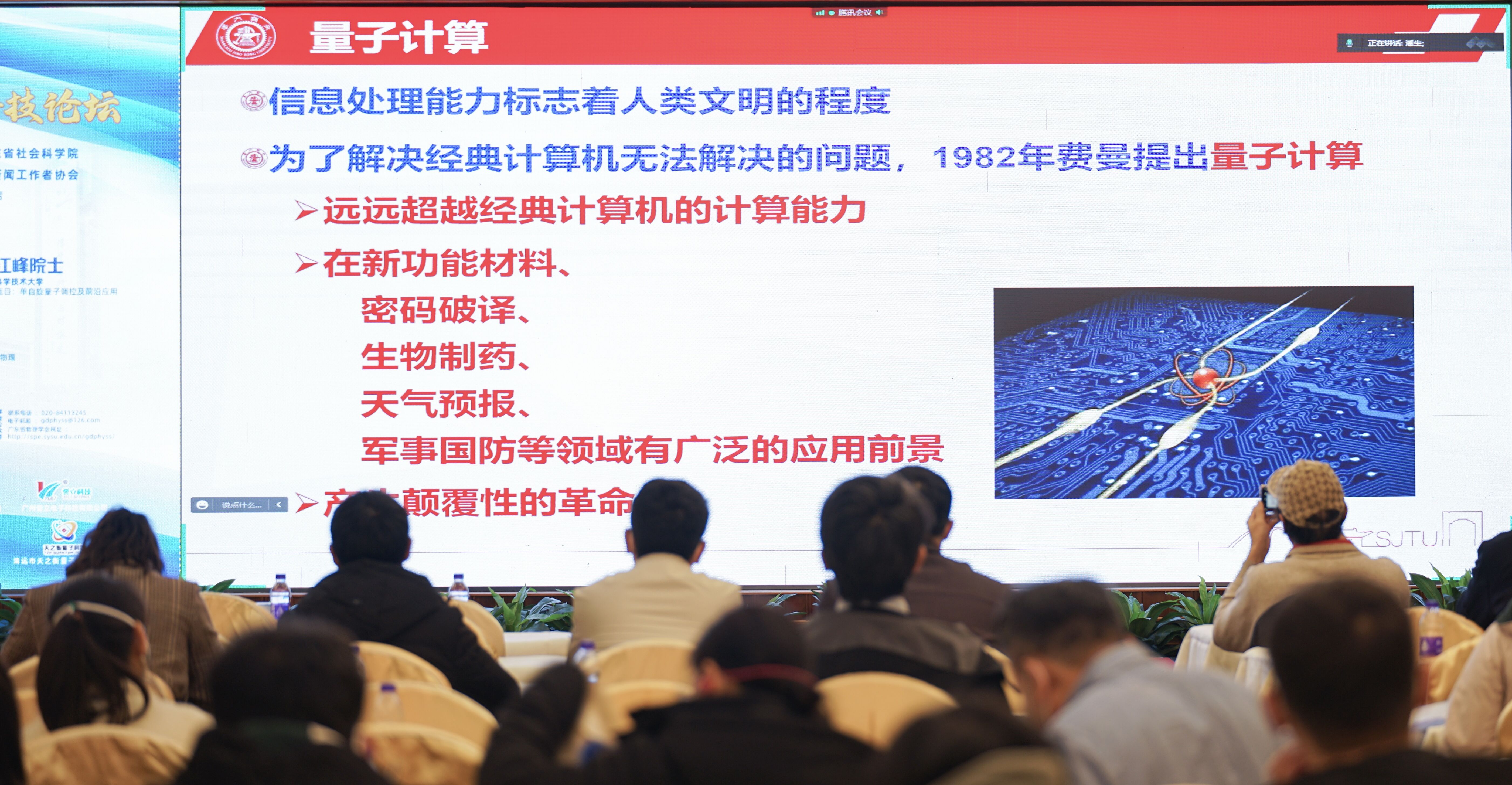发布时间:2022-12-26 作者:在广东省科学技术协会和广东省科学技术厅的指导,在广东省工商业联合会和广东省社会科学院的支持下,由广东省物理学会主办,广州大学承办,广东省磁电物性分析与器件重点实验室和广东科技新闻工作者协会协办的"2022岭南科学论坛系列活动—广东省物理学会年会暨广东量子科技论坛",于2022年12月16-18日在广东清远成功举行。本次论坛采取线上+线下的形式举行,来自省内各高校、科研单位和企业等近200名代表参加了现场会议,大会特邀报告线上在线人数达11万人。