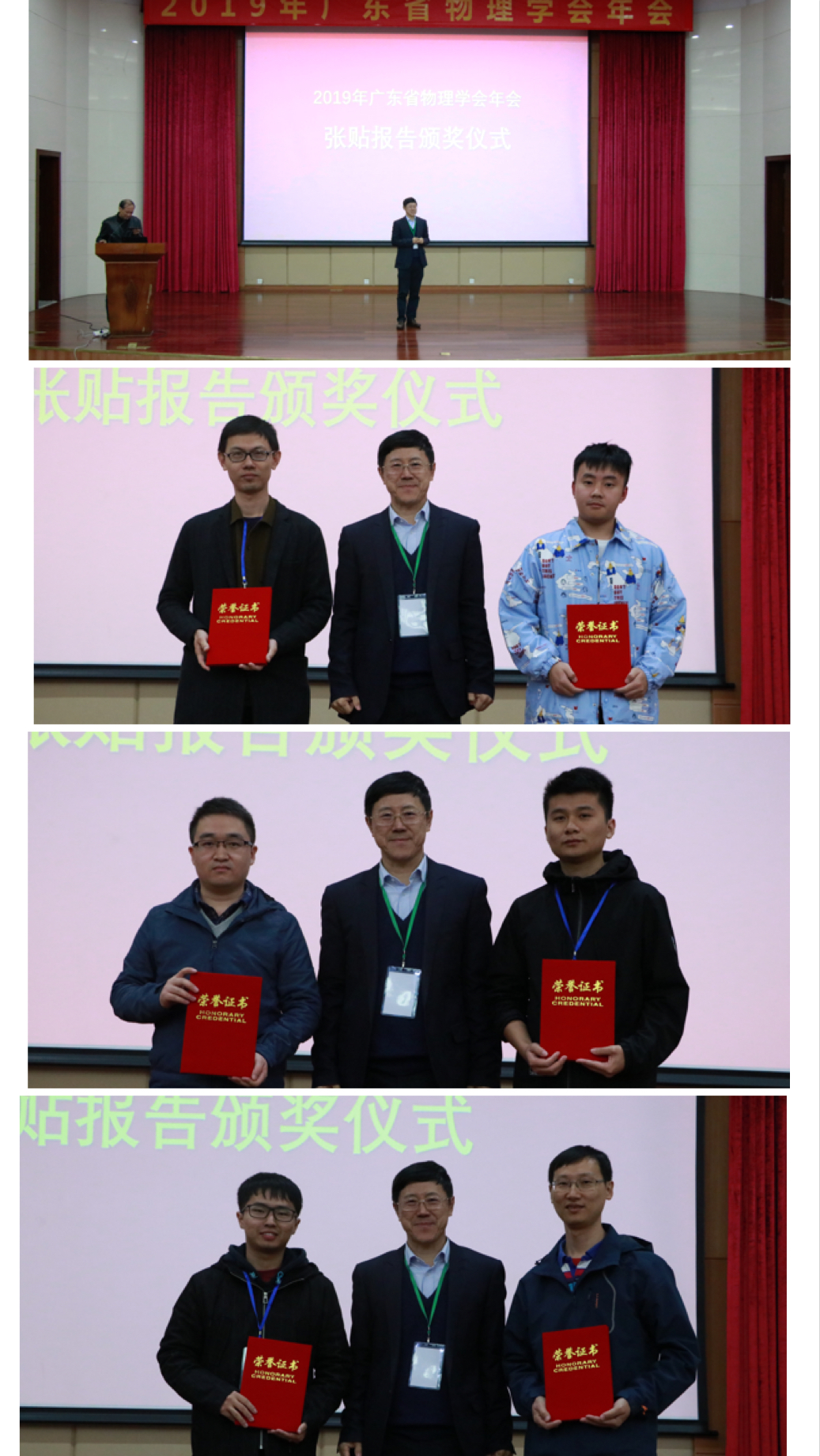 西安建筑科技大学孙博华教授、中山大学罗鑫教授、东莞理工学院黎永青教授、华南师范大学唐志列教授等27位专家学者应邀分别报告了他们在物理数学、凝聚态物理、光学、量子信息、天体物理和物理教育等领域的最新研究成果。张贴海报倍受青年学者和在校研究生的踊跃参与,共展示了26份高水平的张贴报告,其中中山大学胡杨凡老师和佛山科学技术学院张锡梁同学分别荣获张贴报告一等奖,中山大学冉晓雪同学和东莞理工学院吕伟副研究员分别荣获张贴报告二等奖,中山大学吴嘉宁副教授和深圳大学杨君同学荣获张贴报告三等奖。本次年会的丰富精彩学术报告,以及专家学者在会上的热烈讨论,展示了广东省物理学工作者近年来的高水平科研和和教学成果。