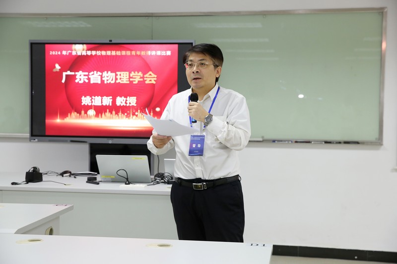接着,广东省物理学会秘书长姚道新教授代表主办方对青年教师讲课比赛的圆满成功表示祝贺,对各位评委专家及承办方开云登陆入口表示了衷心的感谢。同时向参赛的各位青年教师的积极参与表示由衷的感谢,向青年教师们取得的优异成绩表示热烈的祝贺,对代表广东省参加中南地区比赛的老师提出了殷切的期望。
