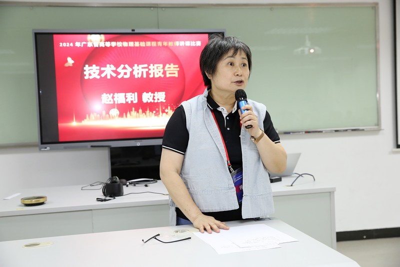 比赛结束后,本次竞赛评委组组长、全国高等学校光学教学研究会副理事长、中山大学赵福利教授做比赛技术分析报告,主要包含以下6个方面:一是比赛时长把控方面,在有限的时间内(如15分钟)进行教学,是对教师能力的一种锤炼,需准确把控,避免超时或不足。二是实验理论方面,在实验教学中教师需深入理解理论,将理论与实验紧密结合,确保教学的全面性和深入性。三是实践与锤炼方面,实验教学需要教师具备丰富的实践经验,通过不断锤炼提升教学效果。四是课程内容方面,教学内容应清晰明了,避免为了比赛而过度增加内容或案例,确保学生能够有效吸收。五是思政融入方面:课程思政是教学的重要组成部分,应自然融入教学中,避免生硬加入。六是实验科学精神方面,作为实验科学,科学性是第一位的,教师应注重实验操作的规范性和数据处理的准确性。赵老师表示深切体会到青年教师的努力和发展给物理实验教学带来蓬勃生机,对未来的物理实验教学充满信心和期许。