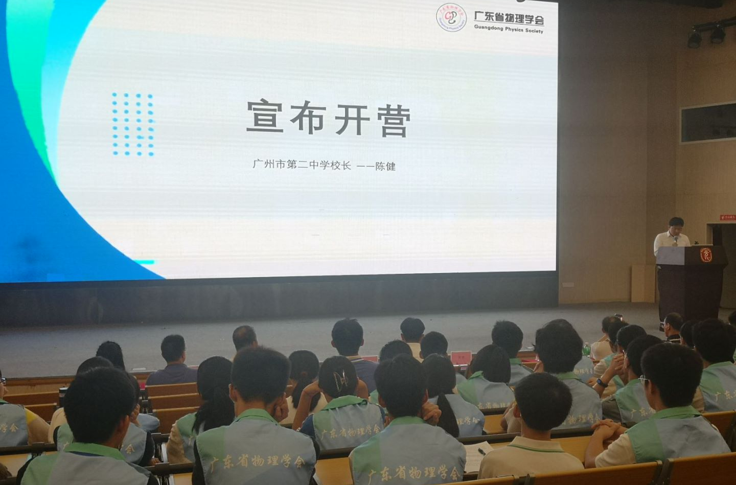 广州市第二中学陈健校长在开幕式上致词,对参加夏令营同学表示最诚挚的欢迎。并鼓励同学们流连物理学科之海,体会知识的奇妙,"与名师论道,与同学交流",增长知识,拓宽视野,勇于探索,充分锻炼物理学习思维,培养物理学习能力,打好基础素质。