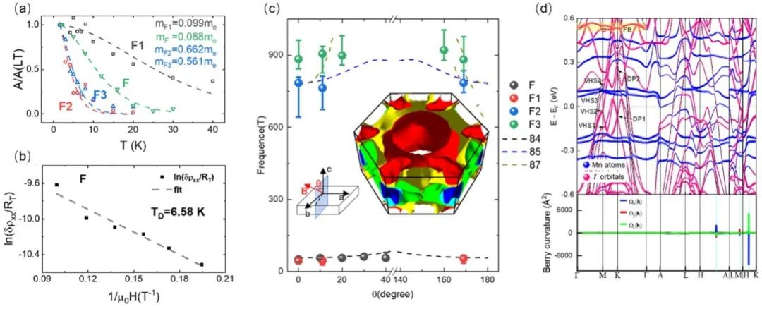 磁性拓扑材料结合了拓扑物理和磁性材料的特性,近年来成为凝聚态物理领域的研究热点。这类材料的特点是其电子结构中存在拓扑保护的状态,例如拓扑绝缘体中的表面态、拓扑超导体中的马约拉纳费米子、拓扑半金属中的Weyl或Dirac费米子等,这使得拓扑磁性材料在自旋电子学、存储器、量子计算、传感器等领域都具有潜在应用。 最近,一种具有高温磁性转变的稀土族笼目磁体RMn6Sn6(R代表稀土元素)引起了广泛关注。这些材料通常由两个磁性亚晶格组成:一个是由Mn离子构成的磁性笼目晶格,另一个是由稀土离子构成的磁性晶格。多种磁性相互作用与独特的晶体结构结合,孕育了多种非平凡拓扑态,例如铁磁性TbMn6Sn6中的陈数量子相,以及在非共线反铁磁性YMn6Sn6和TmMn6Sn6中表现出显著拓扑霍尔效应的非零自旋手性。含有局域磁矩的R元素与4f局域磁矩和Mn 3d磁矩之间的耦合紧密相关,可作为调控量子磁体中拓扑性质的关键因素。相关的多种磁性态伴随着磁性涨落和挫折,使电子结构和费米拓扑变得复杂。这对于理解非平凡的拓扑特性具有重要意义,但目前缺乏相关方面系统性的研究。 在这项工作中,沈冰副教授、侯玉升副教授及合作者结合量子振荡测量和密度泛函理论(DFT)计算,系统性地研究了HoMn6Sn6的电子结构和费米面的拓扑性质。他们在HoMn6Sn6中观察到的高量子迁移率(0.37 m²∙V⁻¹∙s⁻¹)与高导电非磁性金属相当。实验测量上观察到三个不同频率的量子振荡,且表现出强烈的角度依赖性,表明HoMn6Sn6晶体中存在多个具有不同形状和体积的费米面。实验测量结果与DFT计算一致:DFT计算显示HoMn6Sn6具有复杂的费米拓扑结构,包括三个三维空穴口袋和两个二维电子口袋,如图1(c)。通过实验数据处理得到Landau扇形图显示频率为46 T和785 T的量子振荡的Berry相位存在明显的π位移,相应结果表明其具有非平凡的拓扑性质,这与DFT计算揭示的费米能级(EF)附近的Dirac点是一致的,见图1(d)。HoMn6Sn6中大的Berry曲率也使其具有大的反常霍尔电导(AHC)。这项研究表明,HoMn6Sn6是一种室温亚铁磁体,非常适合用于探索非平凡拓扑态及其性质,具有巨大的自旋电子学应用潜力。▲图1(a)根据Lifshitz−Kosevich公式拟合不同SdH振荡模式对应的有效载流子质量。虚线表示拟合曲线,散点图表示数据。(b)F振荡模式的丁格尔图。虚线表示拟合曲线,散点图表示数据。(c)实验测量(散点)和DFT计算(虚线)的FFT频率的角度依赖性。插图显示了旋转磁场和DFT计算的3D费米面的示意图。(d)DFT计算的能带结构(上图)和Berry曲率(下图)。平带由橙色突出显示,两个狄拉克点(DP1和DP2)和四个范尔霍夫奇点(VHS1、VHS2、VHS3和VHS4)由黑色箭头指示。 研究成果于2024年11月29日以“Unveiling the Nontrivial Electronic Structures and Fermi Topology of High-Temperature Kagome Ferrimagnet HoMn6Sn6”为题发表在国际知名期刊《Nano Letters》上。 中山大学物理学院、广东省磁电物性分析与器件重点实验室沈冰副教授、侯玉升副教授和国家脉冲强磁场科学中心的左华坤工程师为论文通讯作者,博士研究生王彬与硕士研究生黄湘烦为共同第一作者。中山大学物理学院王猛教授进行了数据分析与论文撰写,硕士研究生吴德桐参与了实验工作。上述工作得到了国家重点研发计划、国家自然科学基金、广州基础与应用基础研究基金、广东省磁电物性分析与器件重点实验室的大力支持。