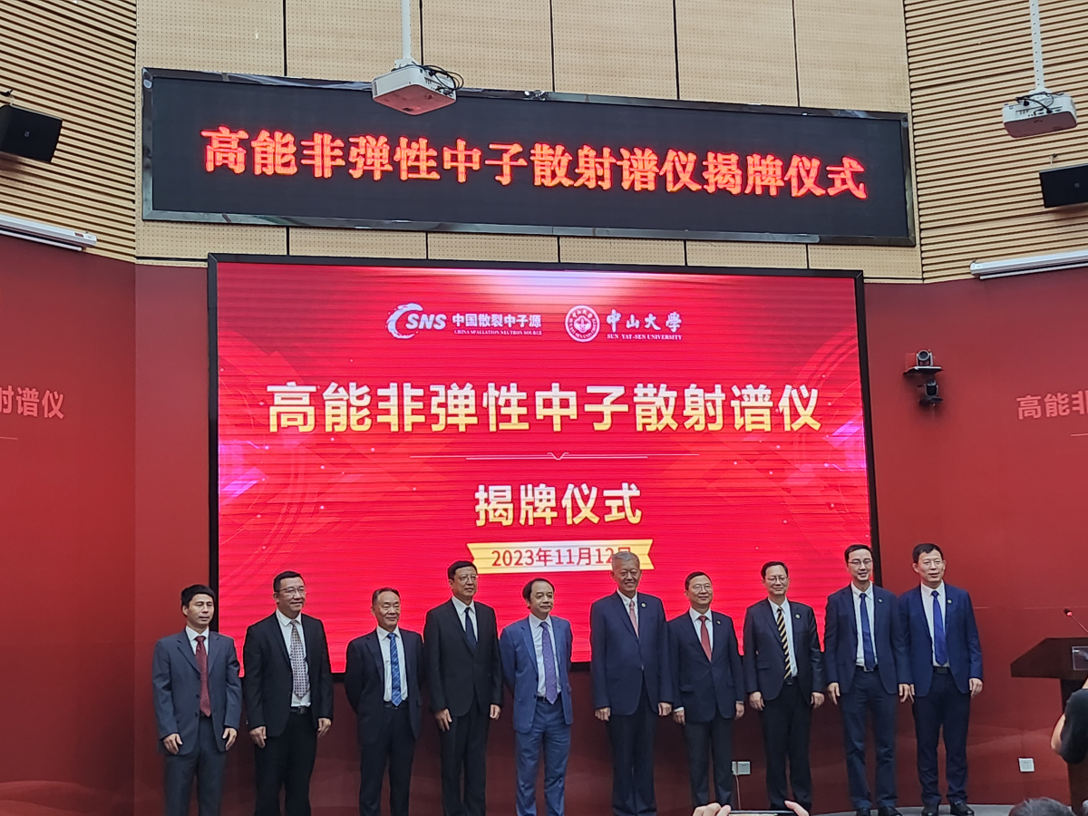 2023年11月12日,广东省磁电物性分析与器件重点实验室(以下简称“省重点实验室”)的师生代表在中国散裂中子源共同见证了由中山大学与散裂中子源科学中心合作建设的中国首台高能非弹性中子散射谱仪(以下简称“中大谱仪”)隆重揭幕仪式。揭幕仪式恰逢中山大学99周年校庆,为学校历史增添了一份特殊的献礼。