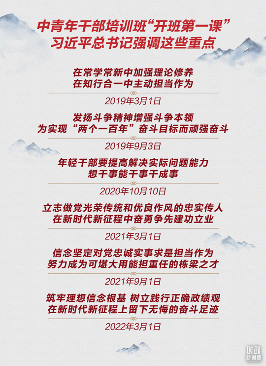 连续6次在中青年干部培训班开讲“第一课”,从“理论课”,到“能力课”,从“传统课”,到“斗争课”等,总书记每一次都对年轻干部提出明确要求。