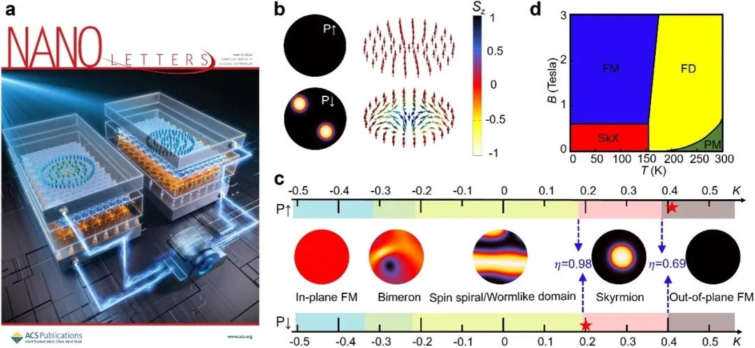 在此项工作中,当In₂Te₃极化向上时,CrSeI/In₂Te₃为居里温度248K的铁磁态;当In₂Te₃极化翻转向下后,其磁基态则转变为奈尔型磁斯格明子态[图1(b)]。更深入的研究发现,该转变是由铁电极化方向可控的磁各向异性导致的[图1(c)]。通过研究温度和外磁场的影响,他们发现CrSeI/In₂Te₃中的磁斯格明子具有强鲁棒性,能在156 K和0.5 T下稳定存在[图1(d)]。特别是,在施加0.5T外磁场的情况下,磁斯格明子的半径会由无外场下的8.7 nm缩小至2.7 nm,为磁斯格明子器件的小型化打下基础。