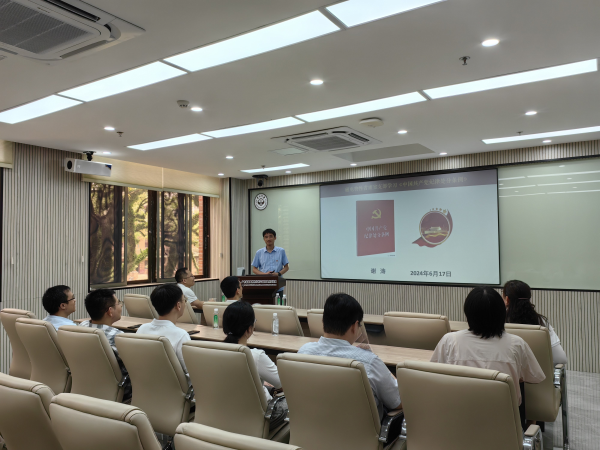 2024年6月17日,广东省磁电物性分析与器件重点实验室党支部(以下简称“实验室党支部”)在广州校区南校园550栋二楼会议室再次集中学习《中国共产党纪律处分条例》,支部党员同志共10人参加学习。本次学习主要由实验室党支部副书记谢涛副教授主讲,实验室党支部组织委员刘新智同志主持。
