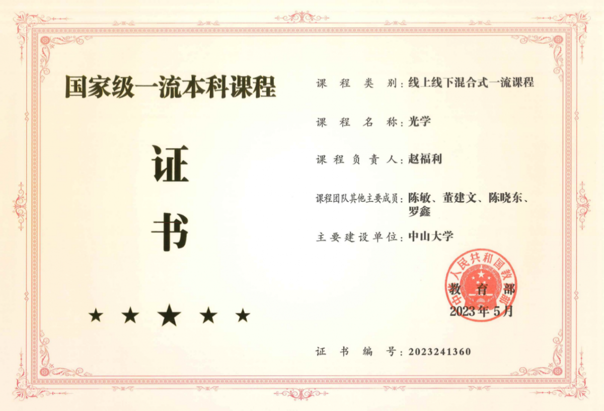 在赵福利教授的带领下,中山大学光学教学团队,积极开展线上一流课程《光学》的二度开发,响应慕课西行,助力课程共享。《光学》慕课于2017年在爱课程网站推出,2022年上线国家智慧教育平台。该课程迄今已运行11个教学周期,受益者达8万余人,辐射范围涵盖国内外。