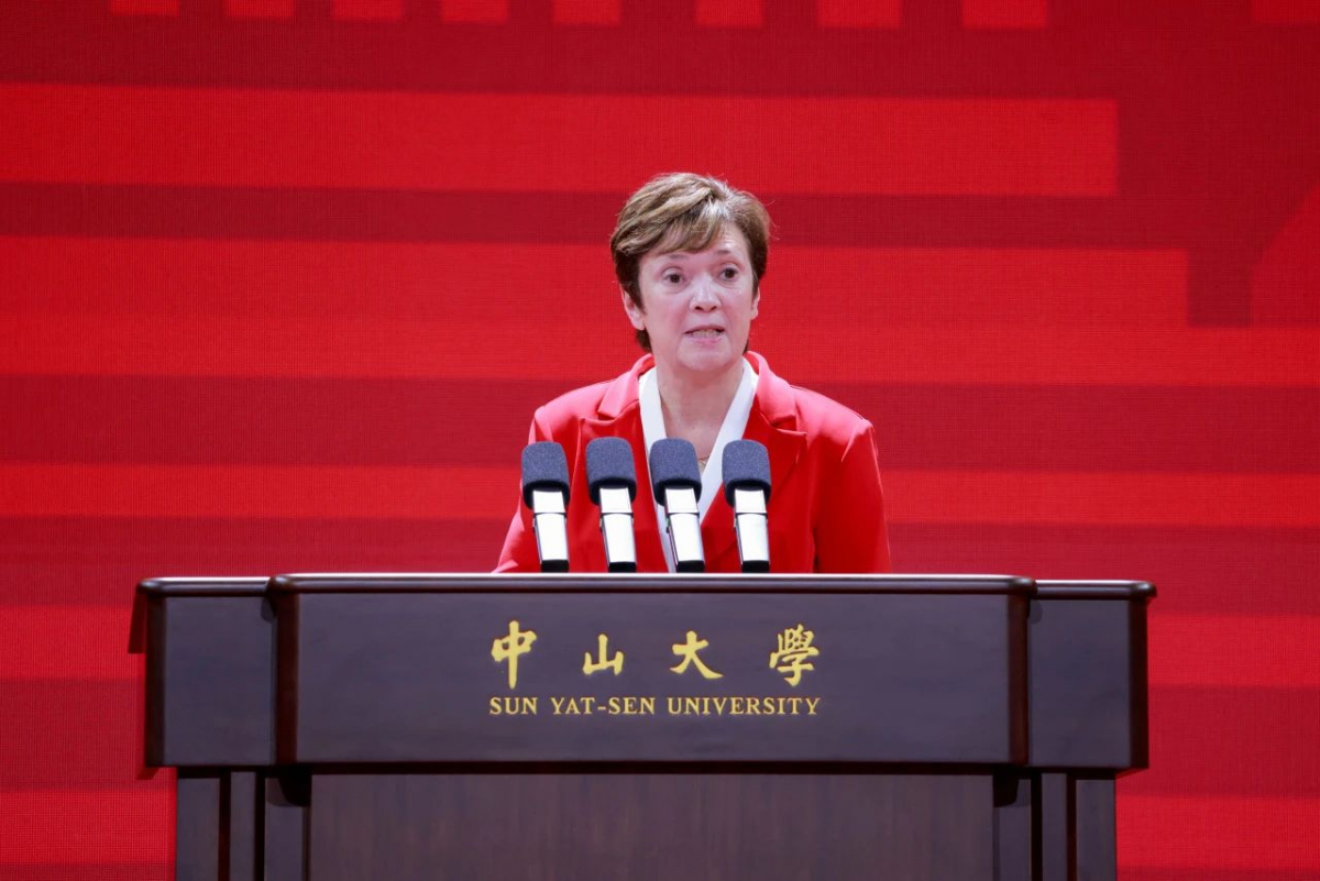 国外嘉宾代表、美国学院与大学协会会长林恩·帕斯卡雷拉在致辞中代表中山大学在全球40多个国家和地区的290多个合作伙伴,向中山大学师生员工、广大校友表达祝贺,同时向中山大学100 年来为中国乃至全世界在教学、科研和社会服务方面取得的卓越成就致敬。林恩·帕斯卡雷拉表示,中山大学在与各种类型机构建立合作伙伴关系方面堪称典范,与世界各地的高等院校及组织开展了许多具有开创性、突破性的合作,为建立合作关系和共同发展目标擘画了清晰蓝图。