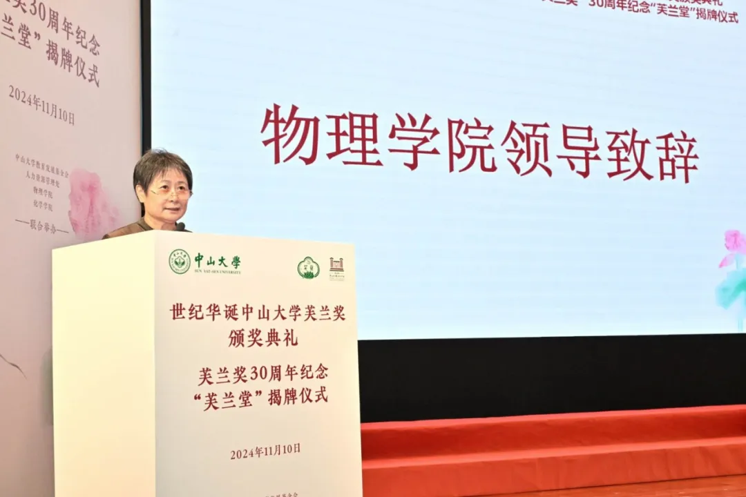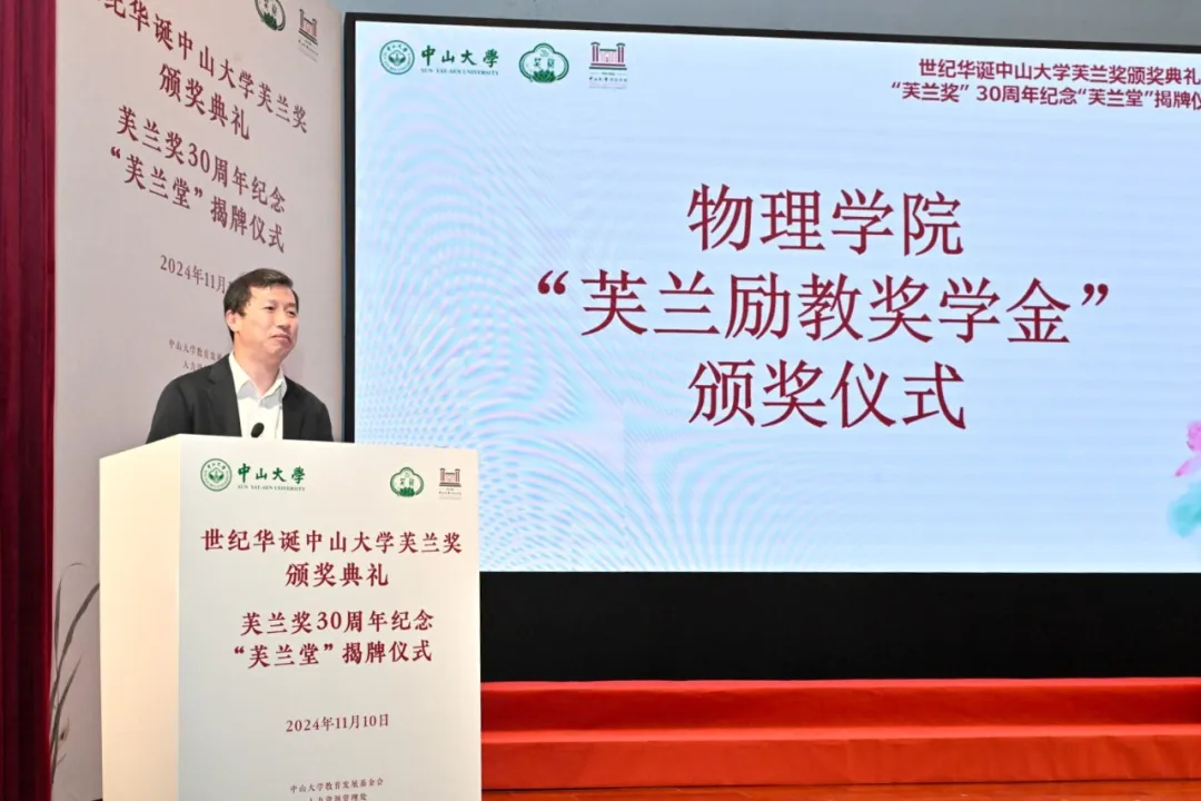 为共贺中山大学世纪华诞,纪念芙兰奖设立三十周年,物理学院2024年“芙兰励教奖学金”颁奖仪式随后在“芙兰堂”讲学厅拉开序幕。