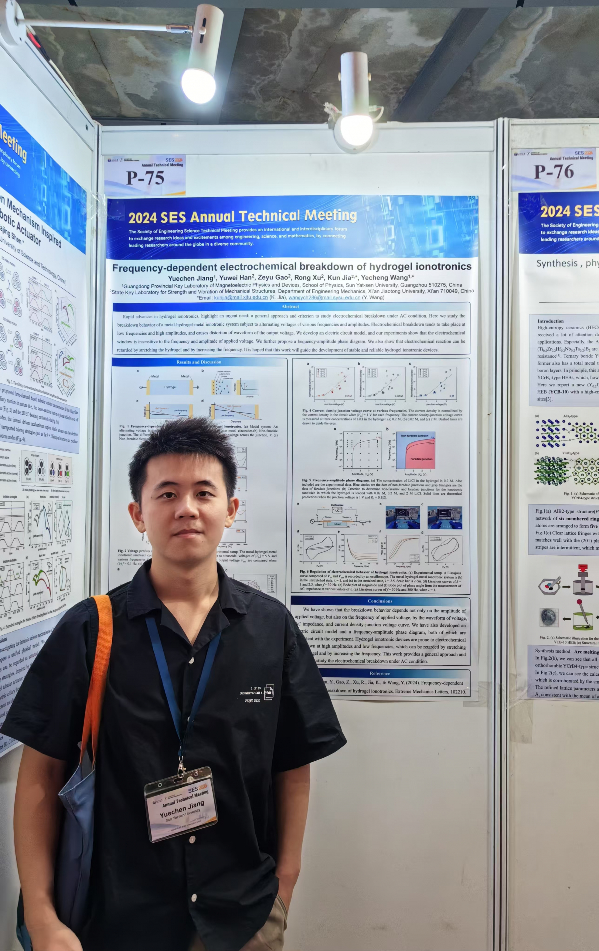 硕士阶段,江玥琛的主要研究方向为软材料与软离电子器件失效行为与机理。在导师的悉心指导下,他扎根基础理论,积极拓展学术视野,系统学习了材料力学、弹性力学、断裂力学、电化学理论等基础知识,并将它们应用到科学研究中。凭借出色的研究能力,他在国际知名力学期刊Extreme Mechanics Letters上以第一作者身份发表论文一篇,并在2024年美国工程科学学术年度技术会议上进行海报展示,同时在第三届全国软物质力学大会上围绕该成果做了口头报告,获得广泛关注与好评。