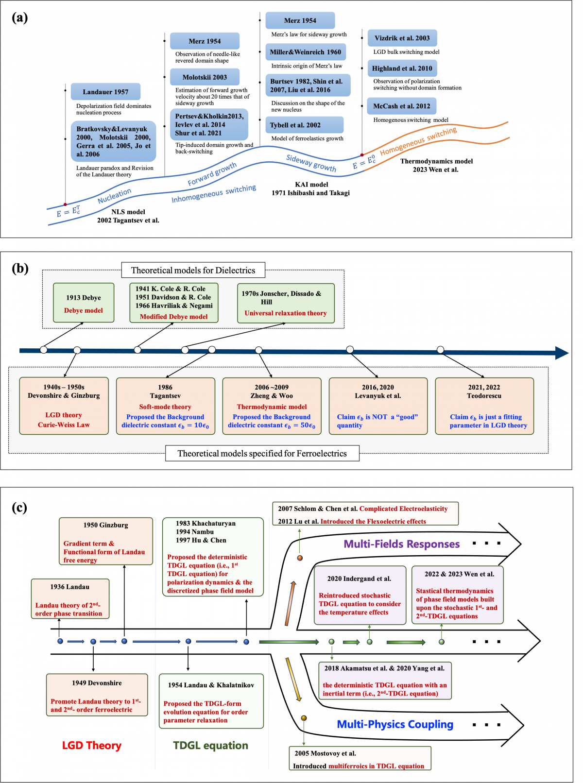 【引言】铁电材料自1920年被发现以来,一直被认为是功能器件应用的候选材料。铁电材料研究已历百年,极性微结构与动力学始终是核心难题。最近,广东省磁电物性分析与器件重点实验室文豪华副教授与合作者发表了综述论文,梳理了极性动力学理论与建模发展及研究范式演进的内在逻辑,讨论了理论模型诞生与发展的历史背景及其局限性,并沿着历史轨迹展示了如何理解极化微观结构和动力学的多尺度性质以及功能器件应用的发展需求,最后提出了理论建模的前景和未来发展方向。