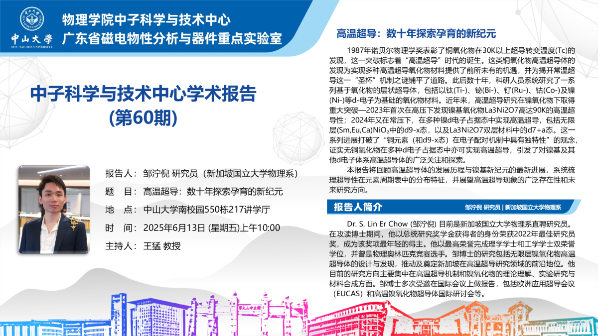 Dr. S. Lin Er Chow (邹泞倪) 目前是新加坡国立大学物理系直聘研究员。在攻读博士期间,他以总统研究奖学金获得者的身份荣获2022年最佳研究员奖,成为该奖项最年轻的得主。他以最高荣誉完成理学学士和工学学士双荣誉学位,并曾是物理奥林匹克竞赛选手。邹博士的研究包括无限层镍氧化物高温超导体的设计与发现,推动及奠定新加坡在高温超导研究领域的前沿地位。他目前的研究方向主要集中在高温超导机制和镍氧化物的理论理解、实验研究与材料合成方面。邹博士多次受邀在国际会议上做报告,包括欧洲应用超导会议(EUCAS)和高温镍氧化物超导体国际研讨会等。