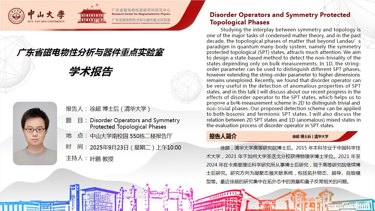 报告题目:Disorder Operators and Symmetry Protected Topological Phasesy