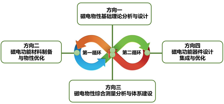 四个研究方向相互平行又互相联系统一。以方向一、三的磁电物性理论分析与实验分析为核心节点,分别与方向二形成针对磁电材料制备优化第一研究循环,与方向四形成针对磁电器件设计优化第二研究循环。所制备的磁电材料只有通过第一循环验证后才能进入第二循环进行相应磁电功能器件研发。双循环互相迭代推进磁电物性分析与器件研究。