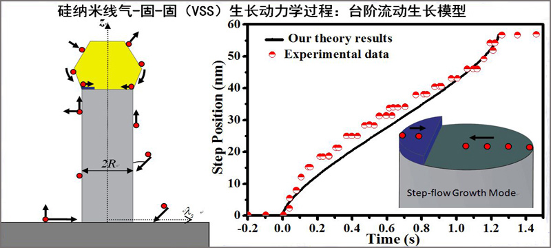 最近,王成新教授研究组的崔浩副教授与工学院的陈衍茂副教授基于组内前期理论工作(Nano Lett. 6, 1552 (2006);Nano Lett. 8, 2731 (2008),Nano Lett. 12, 4032 (2012)),在硅纳米线生长机理的研究中取得新进展。进一步扩展了先前的理论模型,建立了一个普适的硅纳米线VSS生长动力学定量模型,成功的揭示了硅纳米线VSS生长过程中的物理本源。
