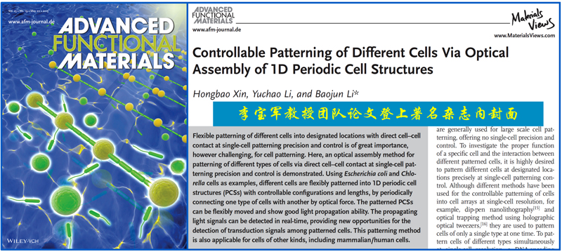 最近,李宝军教授团队采用一种简便的光学方法,实现了细胞的周期排列。他们设计并制作出一根锥形光纤探针,将其放入细胞悬浮液中,然后在光纤中通入对生物细胞损伤很小的980纳米激光,借助从光纤探针尖端出射的光所产生的力、将不同种类的细胞一个接一个地排成周期结构。他们不仅对细菌和真菌等细胞进行了排列,还对人体白血病细胞等极为复杂的细胞进行了排列。研究成果5月18日作为Inside Front Cover论文发表在国际著名学术刊物Advanced Functional Materials (vol. 25, pp. 2816, 2015)。论文第一作者是2011级直博生辛洪宝,第二作者是2014级直博生李宇超。该研究得到了教育部创新团队发展计划、国家自然科学基金等项目的支持。