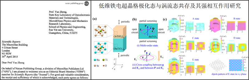 郑跃教授分别于2012年、2014年在该期刊发表物理力学及物理化学领域学术论文三篇, 2015年接受发表一篇,相关研究主要由郑跃教授团队的陈伟津、吴晨明、王莹、熊伟明、刘建一等研究生参与完成。另外,后续与挠曲电效应相关的研究工作2015年5月发表在国际学术期刊JMPS上,研究成果发展了弯曲载荷诱导电畴翻转机理,论文第一作者为郑跃教授的研究生陈伟津。以上系列研究成果被Science, Acta Mater, Scientific Reports, APL等国际著名学术期刊引用。