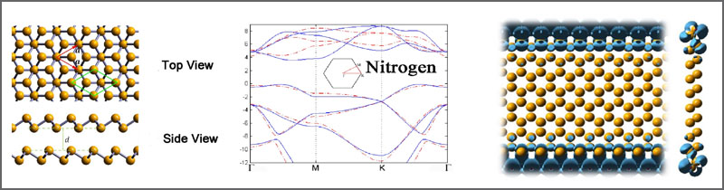 二维电子材料在物理学、材料学、光学、电子信息等领域有着广泛的应用,发现新的二维电子材料和研究它们的性质成为重要的前沿领域。最近姚道新教授研究组使用密度泛函理论和紧束缚模型发现氮族元素(VA族)中的氮(N)、磷(P)、砷(As)、锑(Sb)、铋(Bi)可以形成稳定的类似石墨烯的二维电子结构:翘曲结构的六边形蜂巢格子,一种新的半导体。通过系统的研究,姚道新研究组发现该体系具有0.43-3.7电子伏的间接能隙,可以通过外加电场来调控。体系的翘曲结构主要来自外层电子的sp3杂化,使得系统具有独特的自旋-轨道耦合(SOC),能够保持系统的时间反演对称性,产生有趣的拓扑性质,比如p波超导电现象。该研究组还研究了体系的纳米带结构,发现锯齿边界和扶手型边界在某些情况下可以产生自旋极化的边缘态,同时氮烯的纳米带具有新奇的导电性质。这些性质使得氮族元素二维材料成为一个很有希望的二维电子材料,在物理学、半导体、光学、自旋电子学领域有潜在的重要应用。该工作由博士生李杰森(第一作者)、硕士生田闻川、王伟良副教授、姚道新教授(通讯作者)共同完成,研究成果发表于2015年6月30日出版的Scientific Reports 5 (2015) 11512 (DOI: 10.1038/srep11512)。