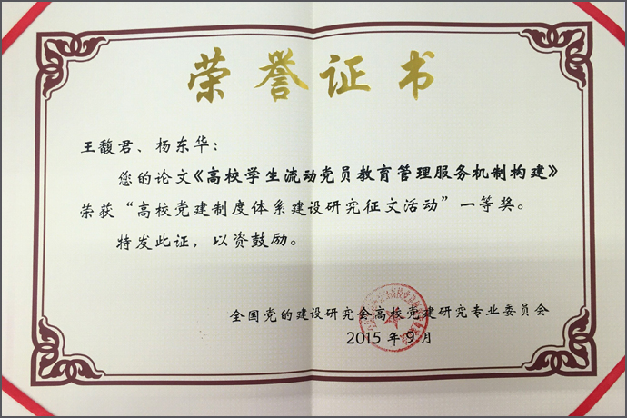 据中山大学新闻网消息:在2015年9月18日召开的全国党建研究会高校党建研究专委会2015年年会上,高校党建制度体系建设研究征文活动评审结果正式公布,我院王馥君、杨东华同志提交的论文“高校学生流动党员教育管理服务机制构建”荣获一等奖。