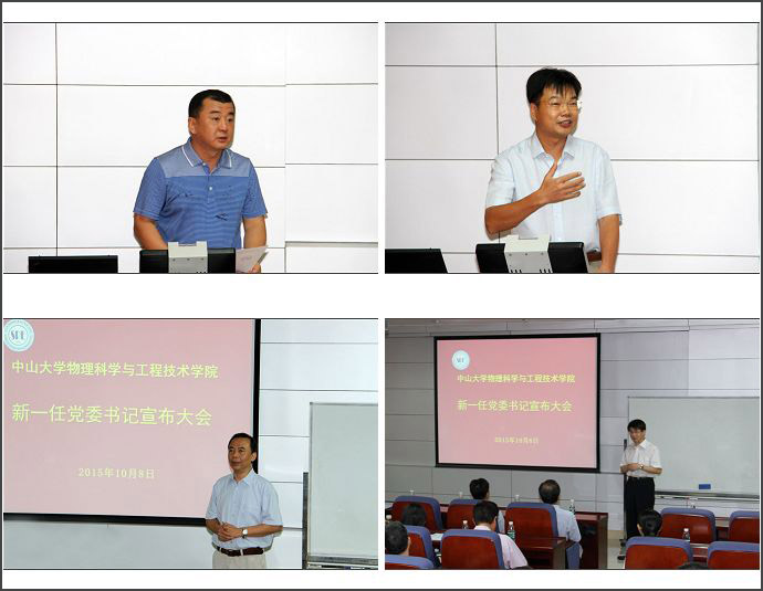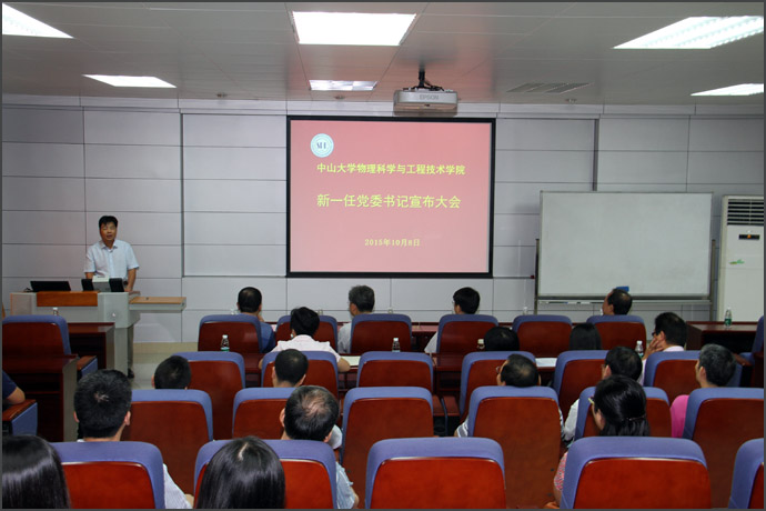 2015年10月8日上午,学校在十友堂300召开物理科学与工程技术学院新一任党委书记宣布大会。中山大学副校长朱熹平教授、校党委组织部武少新部长、物理科学与工程技术学院党政领导班子成员、中法核工程与技术学院和微电子学院领导、物理科学与工程技术学院全体教授、教工党支部书记等出席了会议。会议由校党委组织部武少新部长主持。