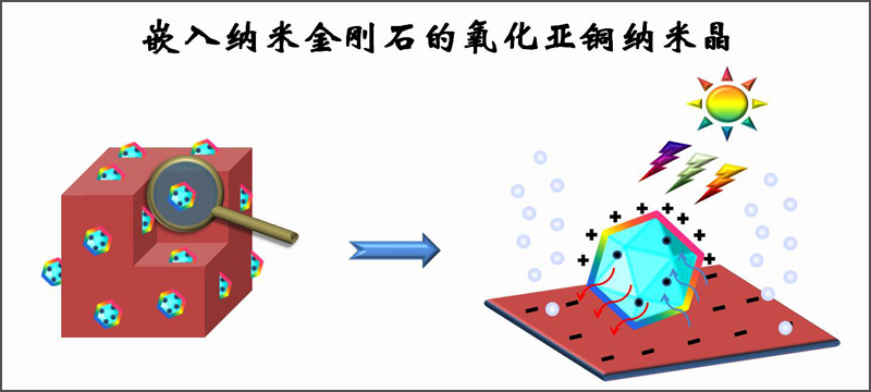 光催化水分解产氢即在水中直接将太阳能转化为清洁、可持续的二次能源——氢能,是环境与能源科学关注的热点。氧化亚铜一直以来都是备受瞩目的典型可见光催化剂。然而,由于电子扩散长度短、空穴迁移率低导致它的光催化性能和稳定性都无法进一步提高。非金刚石相的纳米碳材料,由于其独特的光电性能,已经被广泛应用于提高光催化剂的性能。而以SP3杂化结构碳原子构成的纳米金刚石,却不曾被应用于可见光催化产氢领域。杨国伟教授研究组的林昭勇博士生首次在国际上证实了纳米金刚石也是一种极具发展潜力的提高光催化剂性能的辅助材料。相比于单纯的氧化亚铜纳米晶,嵌入纳米金刚石的氧化亚铜纳米复合结构的光催化产氢性能和光稳定性都提到了极大的提高。其中,光氢转换效率提升了约10倍。由于所制备的纳米金刚石具有宽谱吸收和上转换发光性能,嵌入纳米金刚石的氧化亚铜纳米晶表现出宽谱响应的特性,而且在近红外波段仍然具有较大的量子效率。同时,他们指出,纳米金刚石的供电子性能以及其与氧化亚铜交错式的能带结构,促进了光生电子从纳米金刚石注入到氧化亚铜,实现了电子空穴对的快速分离。显然,这些研究为纳米金刚石在能源科学领域的应用和新型光催化剂的设计提供了新的思路。相关成果已经在线发表于Advanced Energy Materials(DOI:10.1002/aenm.201501865)。