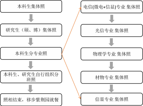 (1)本科生分专业照原则上根据专业人数从多到少的顺序拍照,即光信、微电子、物理学、材料物理、逸仙班。如果某个专业未能按时整理好队伍,则由下一个整理好队伍的专业先照。