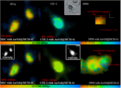 近日, 王惠教授与中山大学肿瘤防治中心李立教授、物理学院邵元智教授合作,采用荧光寿命成像技术研究了一种新型的磁光双模探针Au/Gd@MCM-41在鼻咽癌细胞内的成像机理。发现癌细胞内的自体荧光团与探针的纳米金之间存在明显增强的Forster 能量转移过程。顺磁离子钆与纳米金表面等离子体存在明显的相互作用,这种作用加快了纳米金原子的带间跃迁的弛豫过程。有关结果已发表在Scientific Reports(http://www.nature.com/articles/srep34367)上。