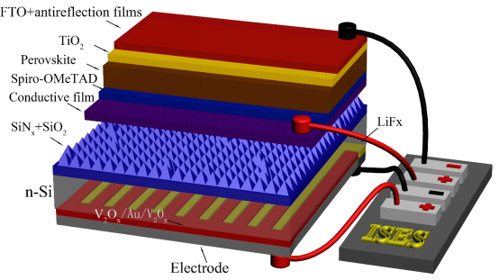 由于全背电极接触结构的晶体硅太阳电池前表面无金属遮挡导致的光学损失,此结构曾多次打破晶体硅太阳电池世界纪录。因此将钙钛矿与MLBC(multilayer back contact)晶体硅太阳电池结合,制备机械叠层太阳电池,可以增强对太阳光谱的吸收利用。其中钙钛矿太阳电池主要吸收低于800 nm范围波长的光,晶体硅太阳电池主要吸收800 - 1100 nm范围波长的光。