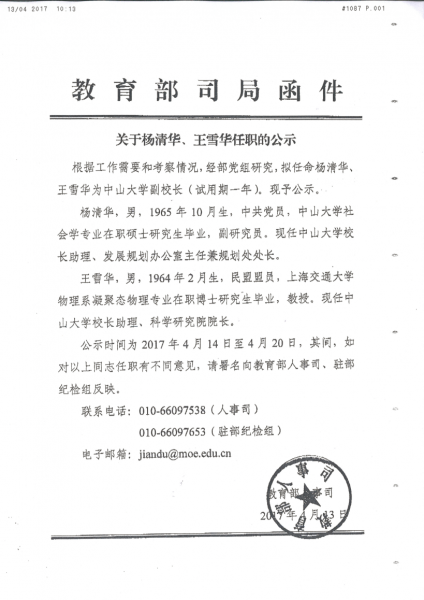 » 关于杨清华、王雪华任职的公示