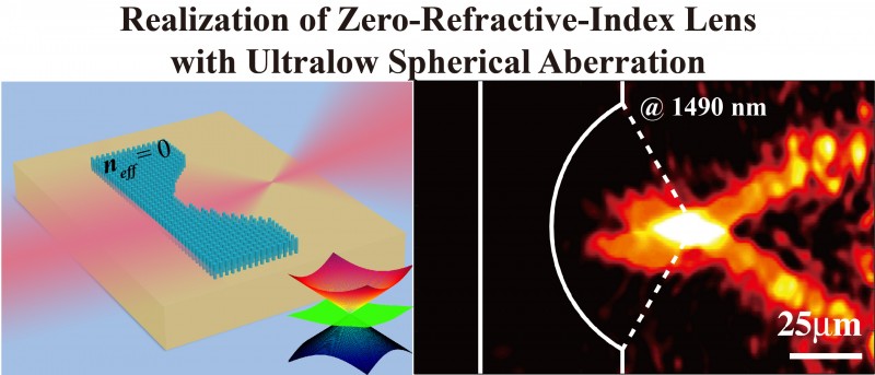 近日,董建文教授团队提出由纯电介质材料实现微纳尺度零折射光学透镜的方案,并在光通信波段观察到反常聚焦效应和超低光学球差等现象。上述光学现象一方面是因为零折射超材料中具有的狄拉克锥线性能带,所以近零折射等效介质理论能够成立;另一方面也得益于大面积硅基制备工艺的运用,使得超材料器件能够获得良好的光学性能。同时,该方案克服了光频段零折射超材料中高损耗和低效率的难题,为零折射超材料集成到硅基光子芯片上提供了一个切实可行的新途径,在光通信、传感、光调制器等领域具有潜在应用价值。相关研究成果正式发表在《ACS Photonics》,题为:Realization of Zero-Refractive-Index Lens with Ultralow Spherical Aberration.详见杂志官方网页链接:http://pubs.acs.org/doi/abs/10.1021/acsphotonics.6b00714。