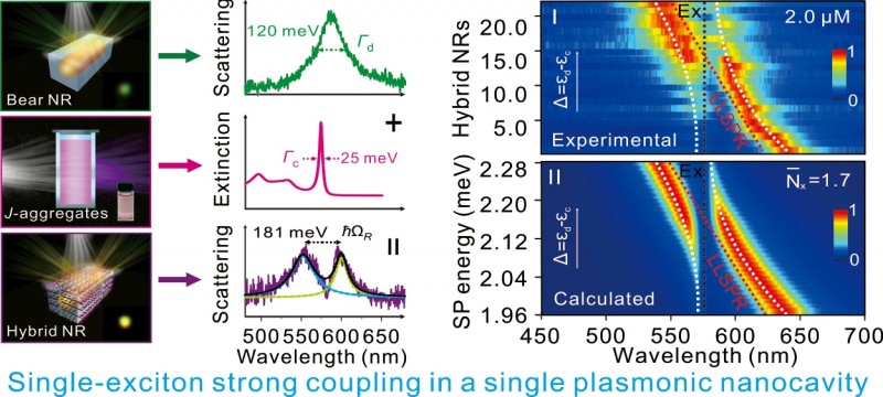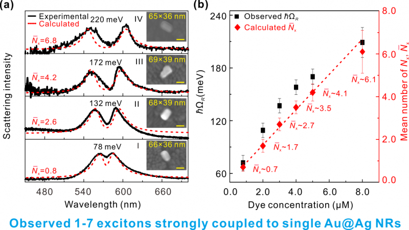 王雪华教授研究团队在上述工作中首先构建了多激子与单个表面等离激元模式耦合相互作用的全量子理论,给出了简洁的实现强耦合作用的“量子光学极限条件”。依据该理论,研究团队精心设计和制备出方形银包金纳米棒结构,实现了将光子局域在71 nm3 的超小模体积内,同时,巧妙地实现了单激子偶联以及小于0.9 nm的超短作用距离的精确控制,最终实现了单个J-aggregate激子与单根纳米方棒之间高达~41.6 meV的耦合作用强度,在室温下成功观测到1-7个激子与单个等离激元纳米方棒的强耦合相互作用。