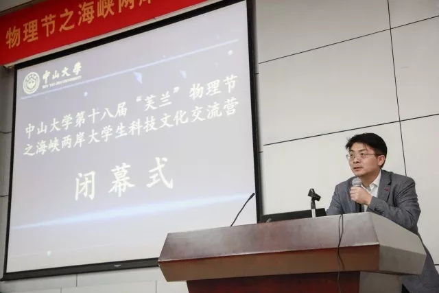 11月28日至12月4日,中山大学第十八届“芙兰”物理节之海峡两岸大学生科技文化交流活动在南校区举行。物理学院党委杨东华书记在开幕式上致欢迎词。物理学院副院长姚道新教授在闭幕式上讲话。此次活动由中山大学物理学院主办,海峡两岸共有来自台湾中山大学、台湾清华大学、台湾“中央”大学、台湾中兴大学、台湾东吴大学、台湾台东大学、北京大学、复旦大学、南京大学、南开大学、武汉大学、厦门大学、吉林大学、中国科学技术大学、四川大学、南方科技大学、中山大学等17所高校,100多位师生代表参加。