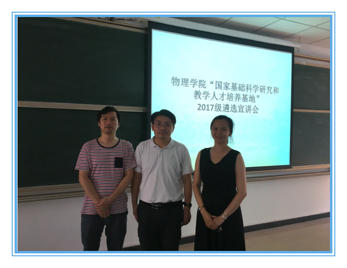 为积极推进学院2018年物理学“国家基础科学研究和教学人才培养基地”遴选工作,学院于2018年05月31日在逸夫楼308举行了2018年物理学基地班遴选宣讲会。姚道新教授、蔡志岗教授、郭东辉教授出席参加了本次宣讲会。