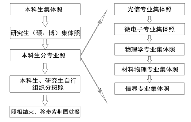 (1)本科生分专业照原则上根据专业人数从多到少的顺序拍照,即光信、微电子、物理学、材料物理、信显等。如果某个专业未能按时整理好队伍,则由下一个整理好队伍的专业先照。
