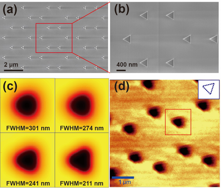中山大学物理学院及光电材料与技术国家重点实验室李俊韬副教授、梁浩文副研究员、周建英教授等人以混合自适应人工智能优化程序设计出亚波长单晶硅超构表面结构,实现了相位的精确控制并减小了单晶硅结构在可见光的吸收。进一步,使用该结构演示了松柏油浸没下数值孔径为1.48的高透过率超构光学透镜。该项目相关研究成果以”Ultrahigh Numerical Aperture Metalens at Visible Wavelengths” 为题发表在Nano Letters, 18 (7), 4460-4466, 2018。刊物审稿人一致认定,该光学透镜的数值孔径为超构光学透镜中现有报道的最高记录。该研究工作第一作者为梁浩文特聘副研究员,通讯作者为李俊韬副教授。