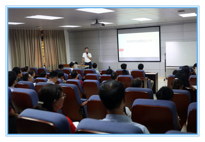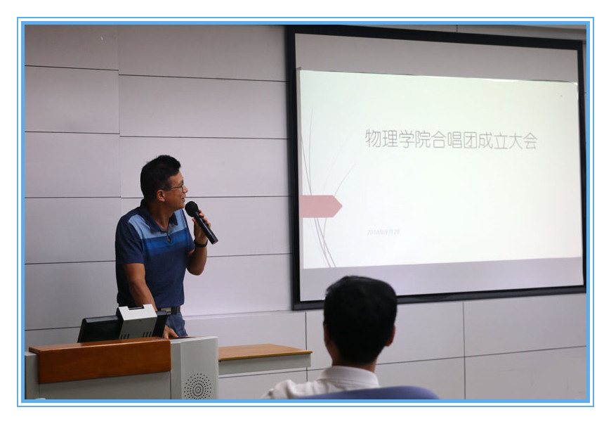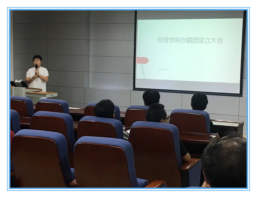 郑跃院长代表学院致辞,向合唱团的成立表示祝贺。学院自2015年12月调整组建以来,不断有新鲜血液充实,教学、科研等方面捷报频传,展现了学院新的气象。郑院长希望通过组建合唱团,在全院教职工中增进了解,加强合作,并在提高教职工艺术修养、活跃学院文化方面发挥作用,在工作生活中构建物理学院大家庭。