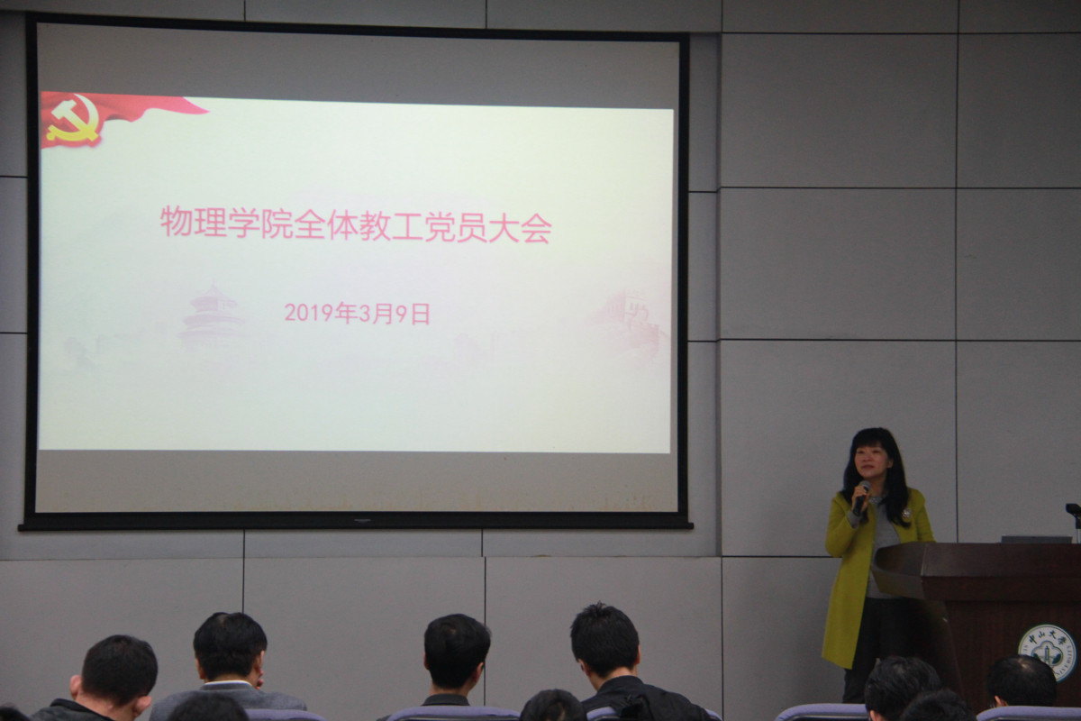 2019年3月9日上午,物理学院召开全体教工党员大会,传达贯彻落实校党委陈春声书记在学校2019年重点工作布置会上的讲话精神,全体教工党员参加。会议由许东黎书记主持。