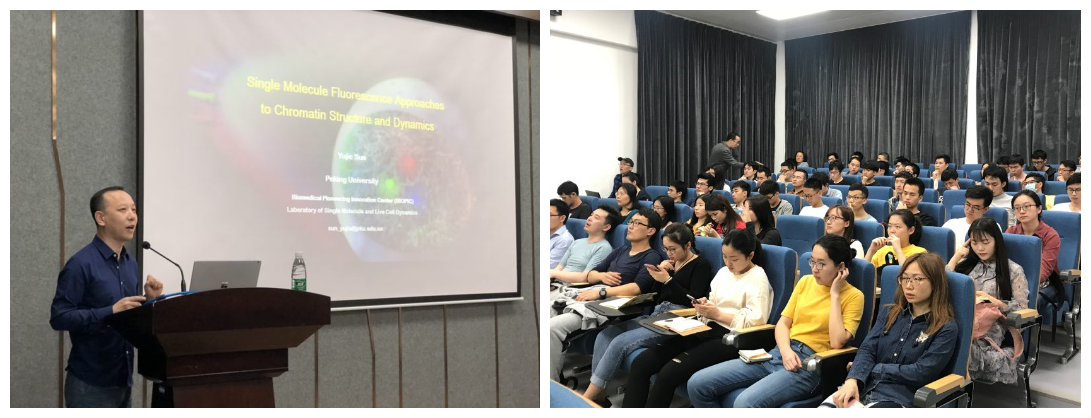 北京大学孙育杰研究员是国家杰出青年基金获得者,主要从事基于单分子荧光和超分辨成像技术的细胞染色质动力学研究。孙老师从染色质的结构功能讲起,介绍了染色质动力学研究中的一些关键性问题,如为何细胞核内多条染色质不会缠绕在一起,染色质上转录和复制的热点区域如何形成等,从而引出了单分子荧光成像和超分辨成像技术,指出这些技术在回答上述关键问题上具有的独特优势。进一步,还介绍了如何利用体外单分子技术来验证DNA调节蛋白结合的别构效应,如何利用体内超分辨成像技术来研究染色质结构对DNA复制起始和转录的调控作用,以及如何利用多色染色体位点成像新方法来研究染色质动力学等。报告结束后,面对同学们的踊跃提问,孙老师都一一做了精彩解答。