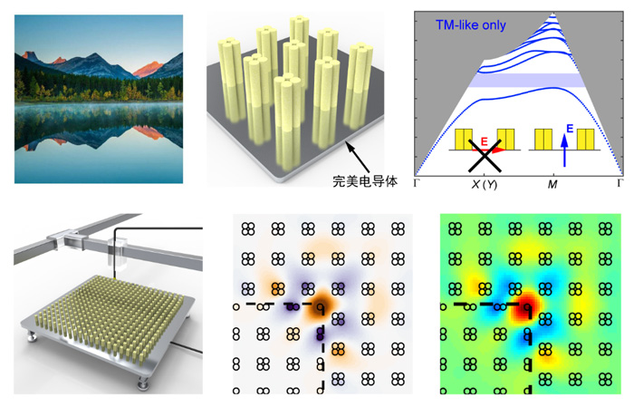 受湖面成倒影这一生活现象的启发,中山大学物理学院董建文教授研究团队设计了以完美电导体作为衬底的新型光子晶体平板结构,完美电导体的引入不仅通过加倍介质柱的等效高度来降低实验样品制备难度,还通过抑制类横电模式来消除模式串扰对实验测量的影响,巧妙地克服了上述难题。