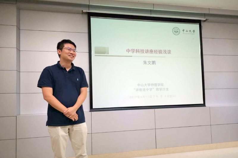 张宏浩教授、唐健副教授、朱文鹏教授分别以《浅谈如何做好科普演讲》、《与中学生讨论物理并宣传中大特色》、《中学科技讲座经验浅谈》为题,根据自己送讲座进中学的切身经验,从中学的联系、讲座的选题、表达的技巧,到讲座后的总结,从不同的角度进行了非常精彩的分享。