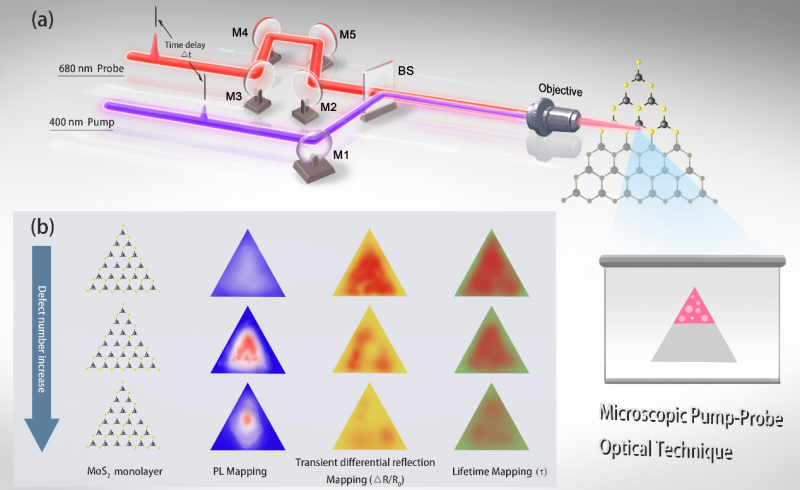 近日,我院王雪华教授、周张凯副教授和虞应研究员等人将超快泵浦探测与微区暗场测量相结合,自主搭建了显微超快光学泵浦探测系统。该系统集成了显微反射谱、透射谱、PL谱及瞬态吸收谱的测量功能,能够实现小于100nm尺度的纳米结构定位以及原位光谱收集,保证了纳米结构光学测量条件一致性和稳定性,为后续微纳光学和量子光学的研究奠定了重要基础(图1a)。比如,建立在该系统的高时间和空间分辨率基础上,他们不仅可以实现对二维材料表面缺陷的扫描成像,还可在微区上对二维材料表面缺陷的密度和激子寿命进行定量表征(图1b)。该研究工作表明,显微光学泵浦探测技术不仅能够避免电子显微技术一些缺点(比如成本高昂、扫描范围小且速度慢、对样品制备要求高且具有破坏性),同时还显示出其他显微光学探测技术不具备的一些优势,比如缺陷密度的定量化表征与激子动力学过程的可视化表征。