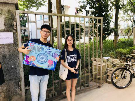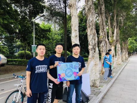 热情的物理学院志愿者们遍布校园,他们举着“物理学院”的迎新牌,为我院新生介绍校园地标建筑,带领他们熟悉校园并指引他们进行体检等事项。