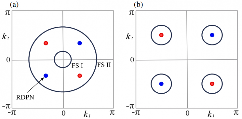 图:以二维为例,当费米面(黑线)和可移除超导配对节点(红点和蓝点,