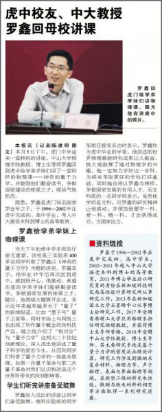 2019年11月5日,我院罗鑫教授回到自己的母校虎门中学,开启了中山大学“送讲座进中学”活动。讲座主题为“神奇的量子世界”,共有400余名师生参加。