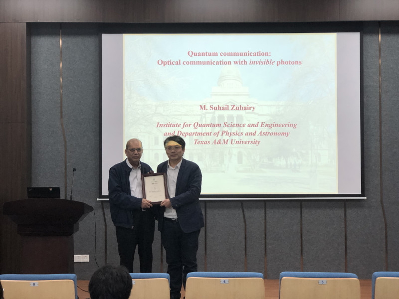 2020年1月2日下午,我院在哲生堂三楼报告厅举办了第十四期高兆兰讲座,邀请了美国德州农工大学(Texas A&M University)M. Suhail Zubairy教授进行题为“Optical communication with invisible photons” 的报告。讲座由廖泽阳副教授主持,姚道新副院长出席讲座并为Zubairy教授颁发高兆兰讲座证书。