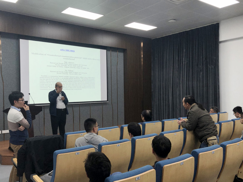 讲座中,Zubairy教授从最基本的信息加密和信息安全讲起,用非常通俗易懂的语言介绍了最为常用的公钥加密体系 RSA的加密原理。然后介绍了如何利用光束分离器的量子干涉效应来实现无相互作用探测的原理。 紧接着进一步介绍了他们提出的如何实现在两地之间进行无光子传递的通信,并介绍了中国科大潘建伟老师组对他们提出的理论方案的实验验证。在讲座后,老师和同学们踊跃提问,Zubairy教授一一做了精彩解答,并进一步与师生进行了交流。此次活动有效促进了我院与美国德州农工大学量子科学与工程研究所的学术交流。