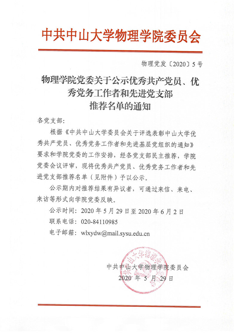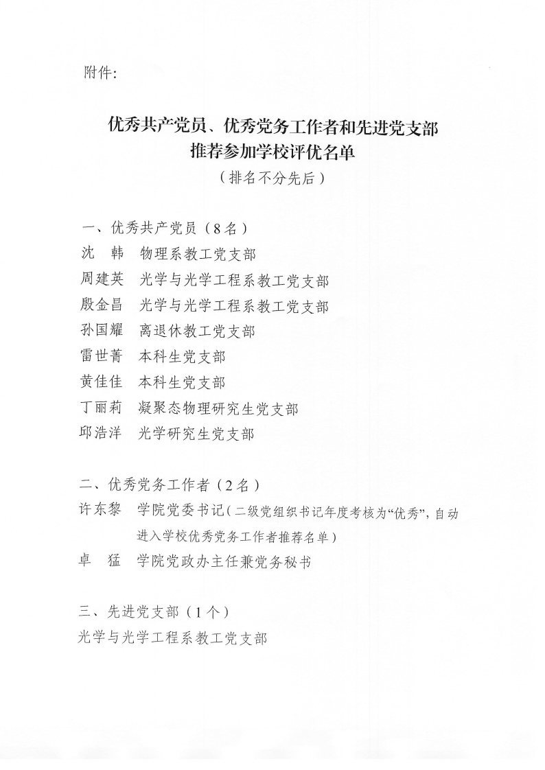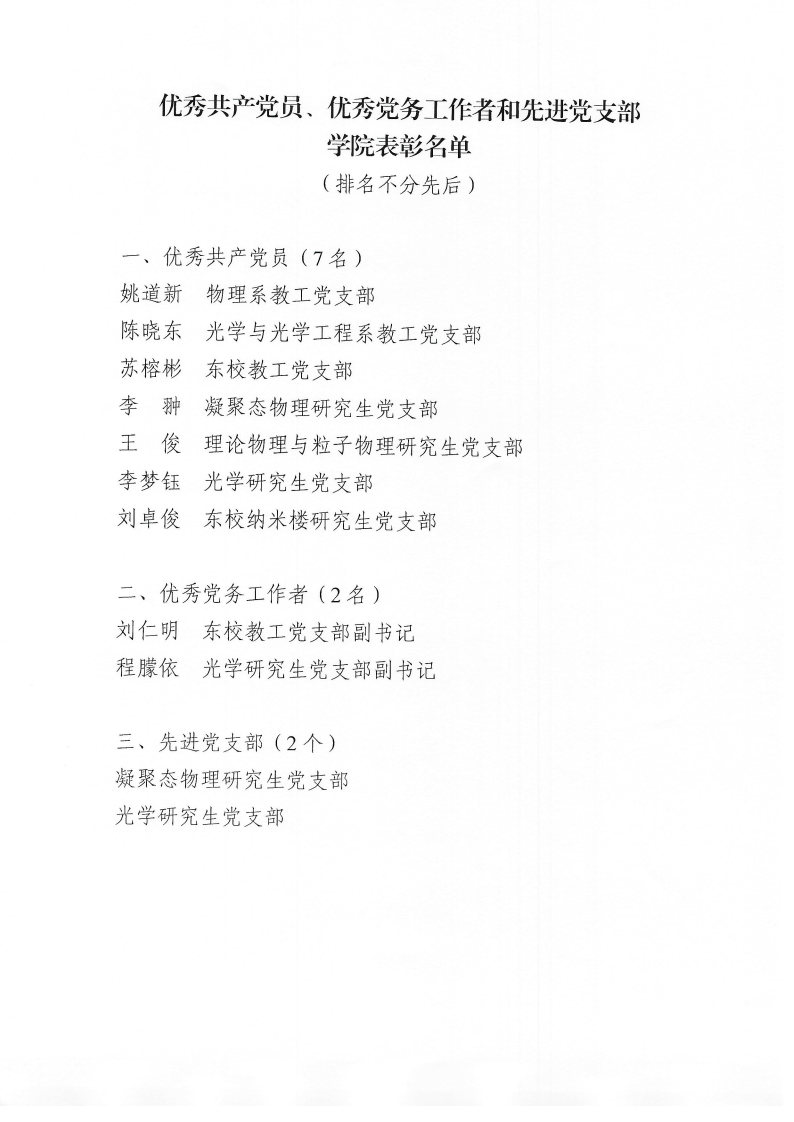 物理学院党委关于公示优秀共产党员、优秀党务工作者和先进党支部推荐名单的通知